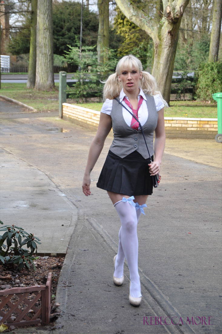 Блондинка Ребекка Мор обнажает свои сиськи и пизду в наряде школьницы
