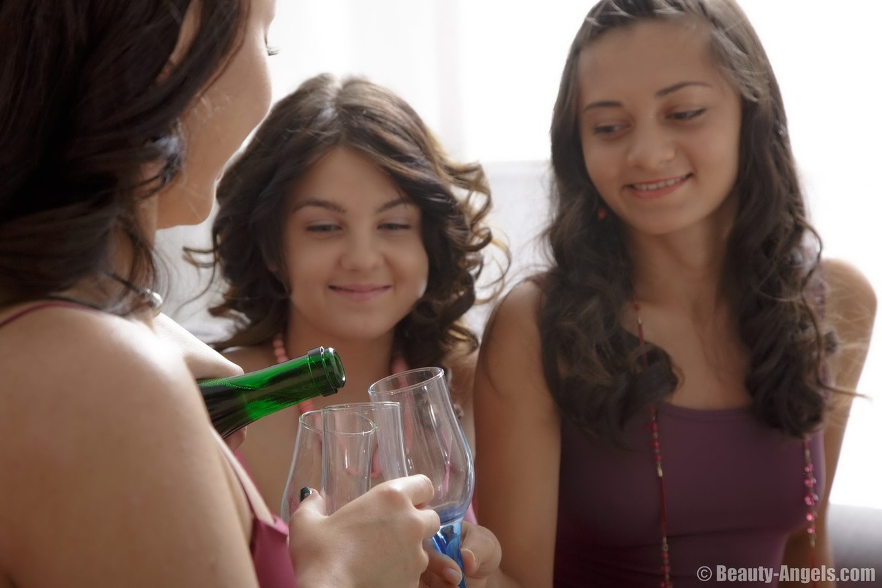 Девушки-лесбиянки принимают участие в сексе втроем, распивая бутылку спиртного