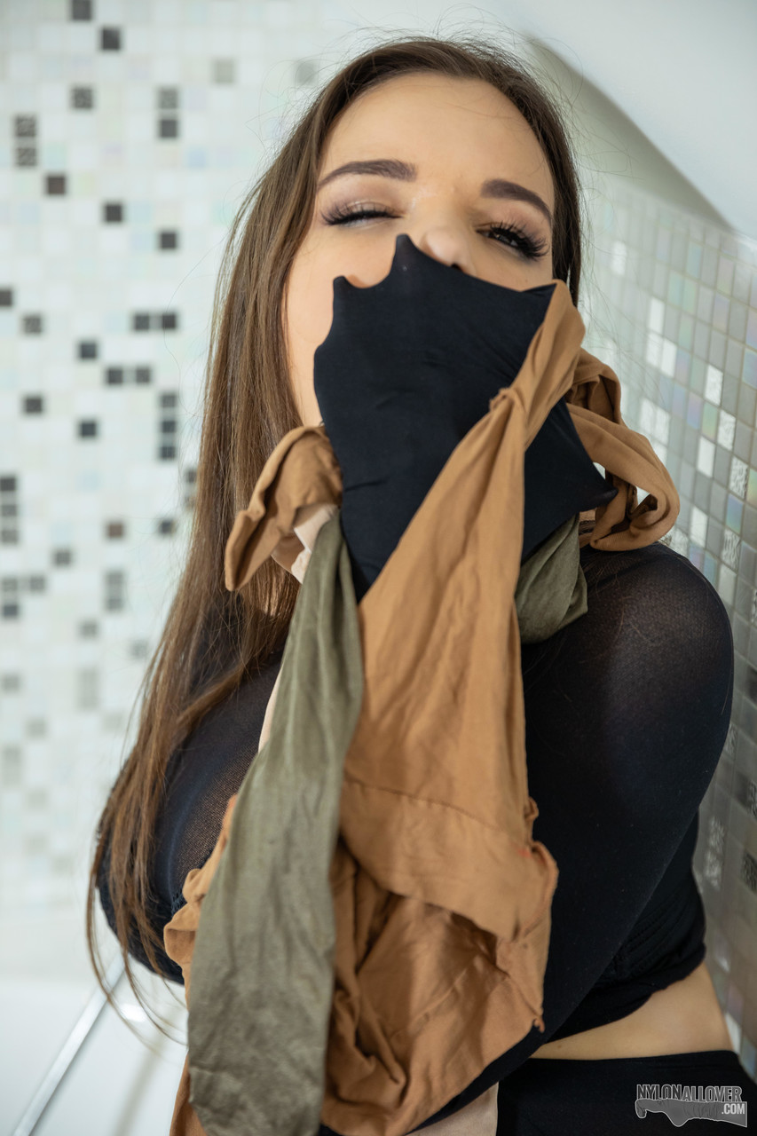 Грудастая девушка София Ли играет с дилдо, будучи одетой в колготки