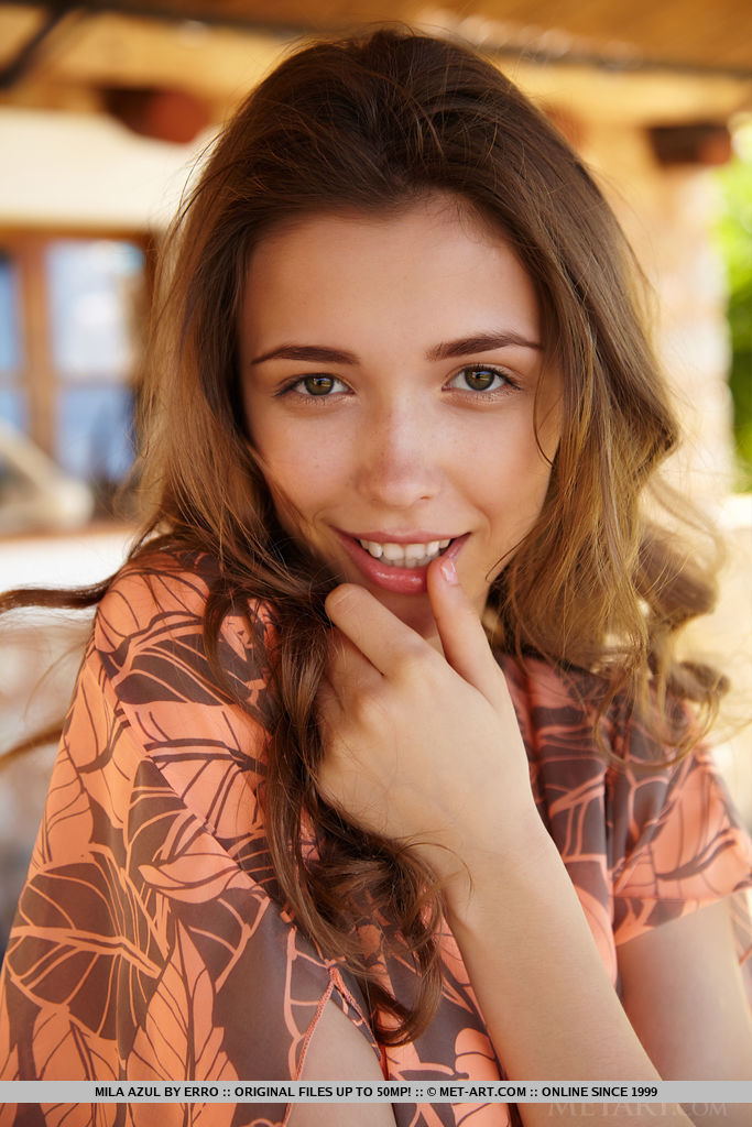 Худенькая девушка Мила Азул снимает свое платье, чтобы позировать обнаженной на столе для пикника