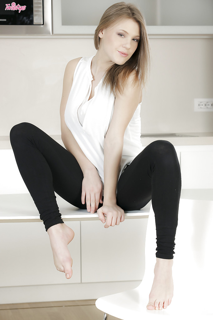 Худенькая порнозвезда Виола демонстрирует свою попку в черных чулках
