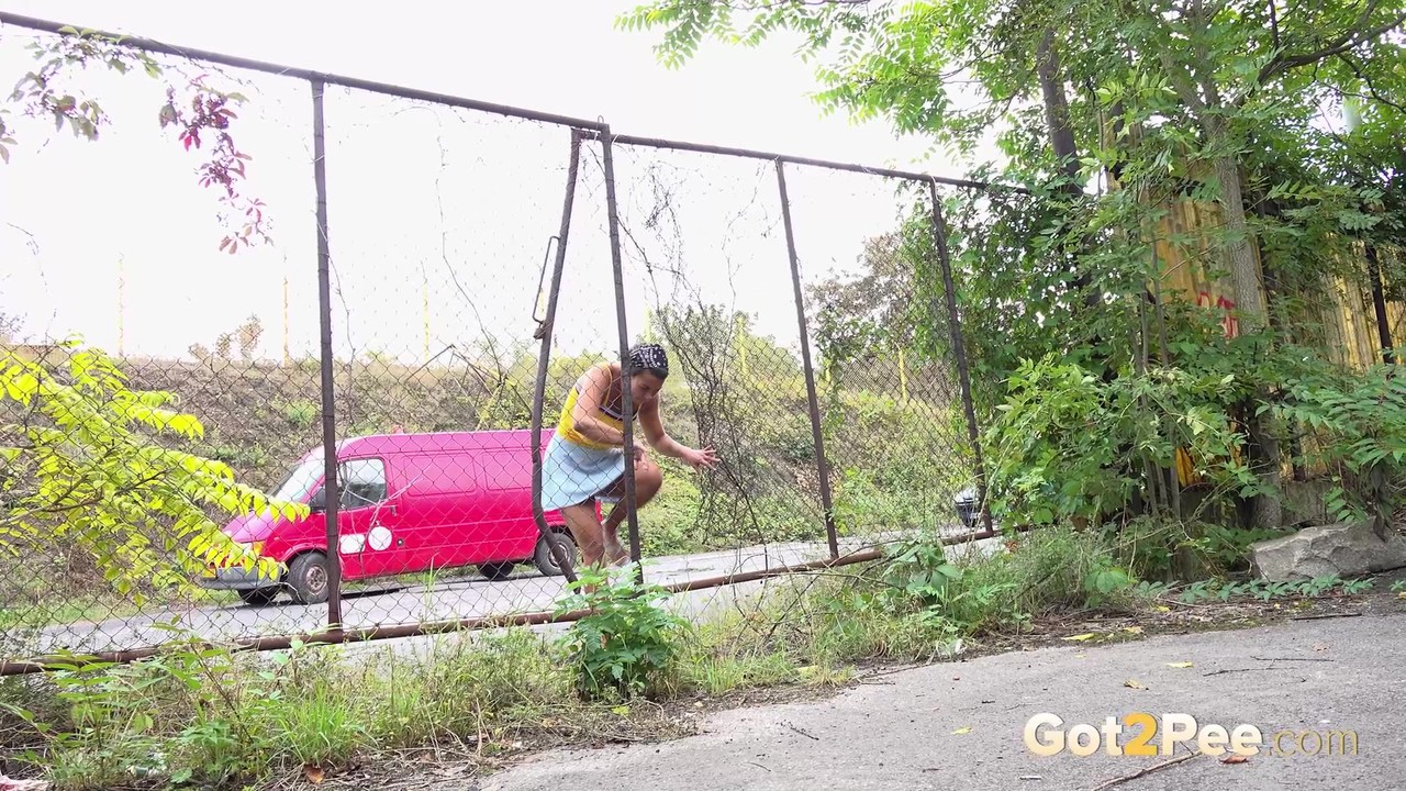 Коротко стриженная девушка Хлоя Ламур крайне нуждается в том, чтобы помочиться на участок тротуара