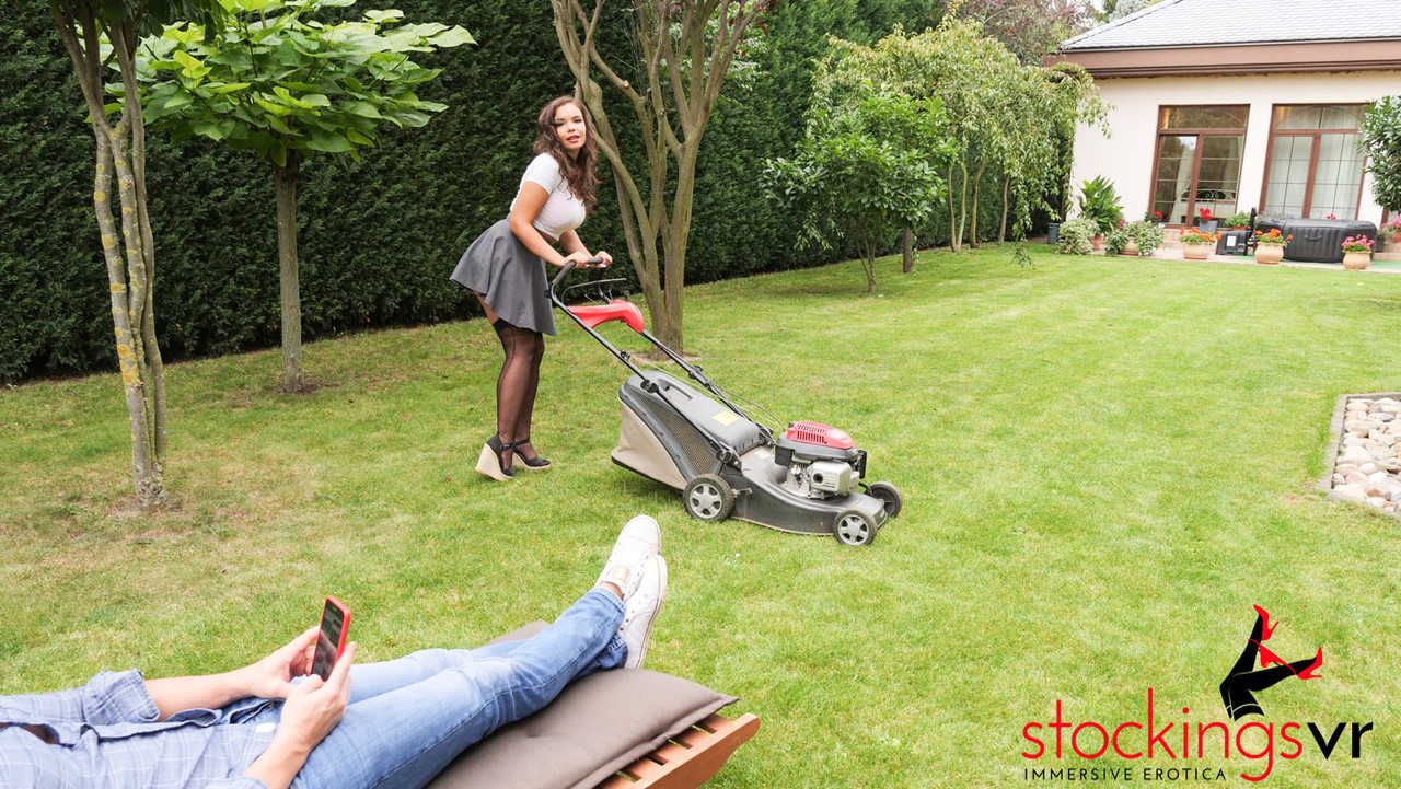 Красивая молоденькая София Ли подстригает газон в нейлоновых чулках FF перед сексом