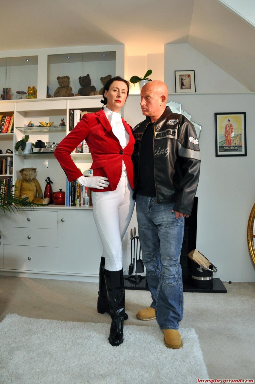 Лара Латекс готова к тому, чтобы ее трахнули в ее брюках для верховой езды с открытой промежностью и сапогах