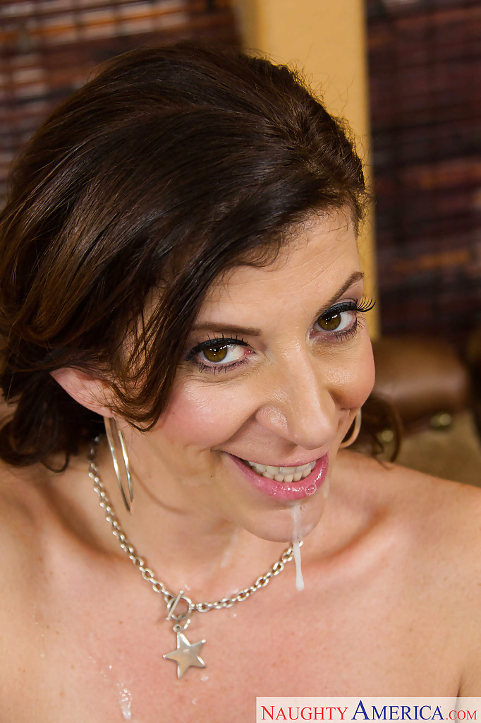Мама-брюнетка с большими сиськами Сара Джей сосет и глотает сперму