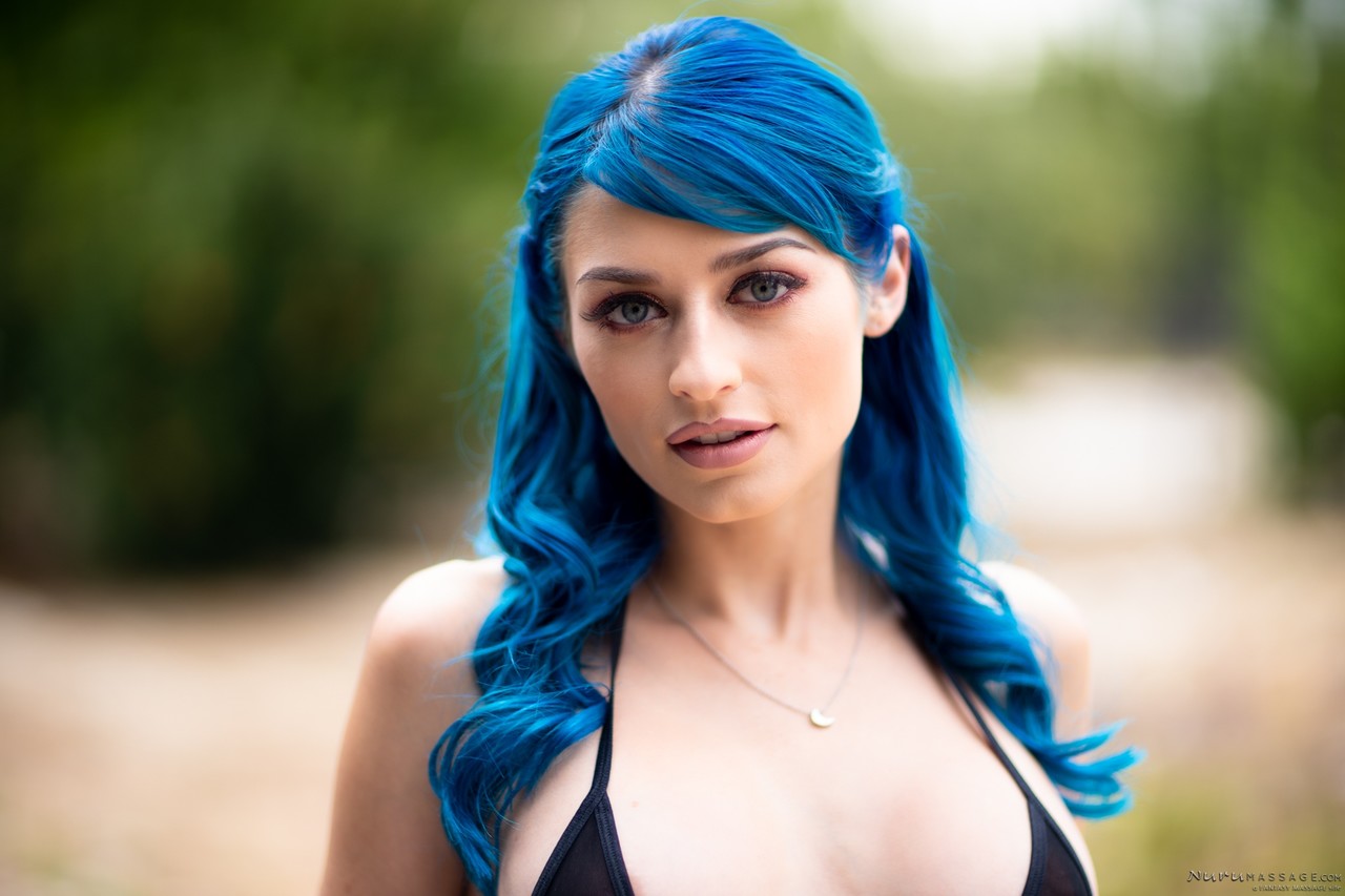 Одинокая девушка с голубыми волосами Jewelz Blu снимает свое бикини на открытом воздухе