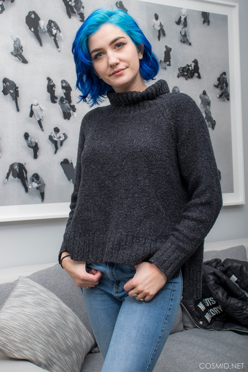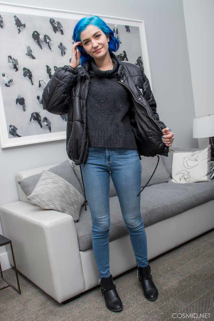 Одинокая девушка с крашеными волосами Скай Блю обнажает свои красивые сиськи в эротическом стриптизе