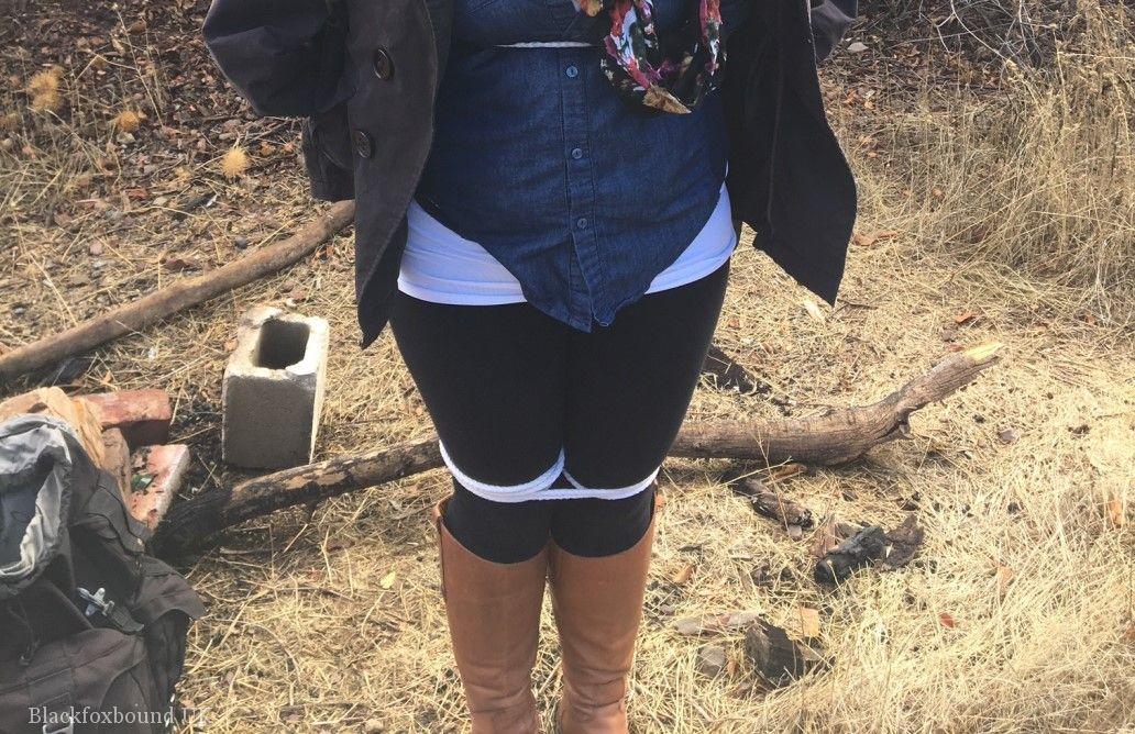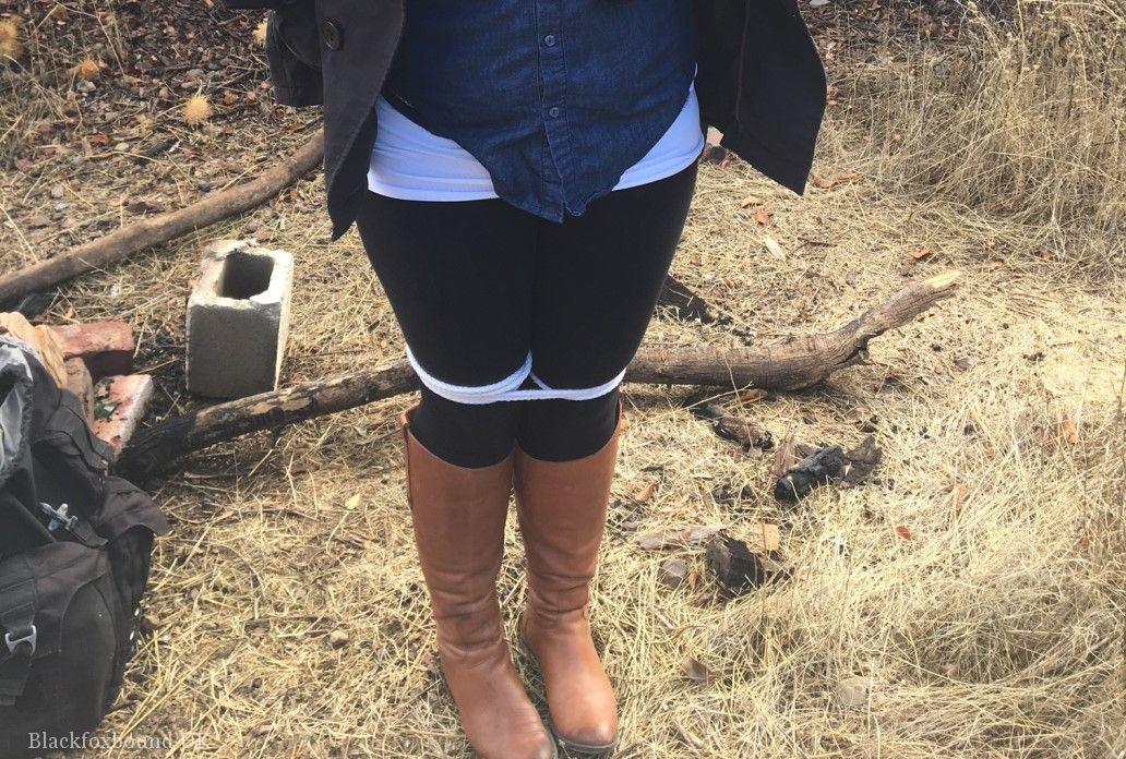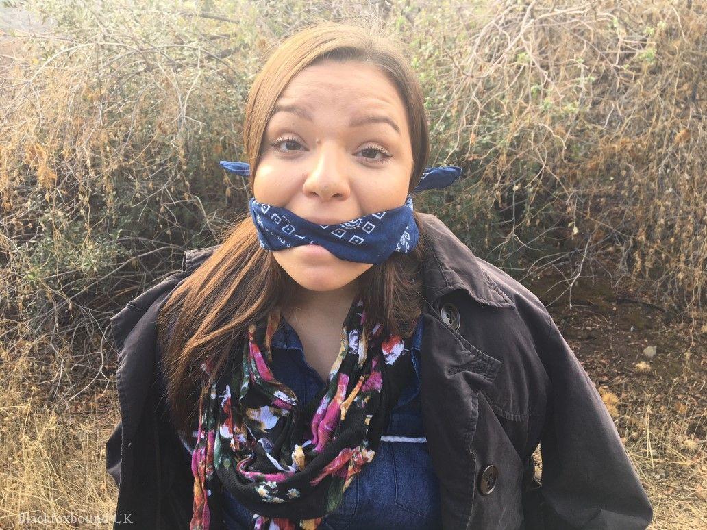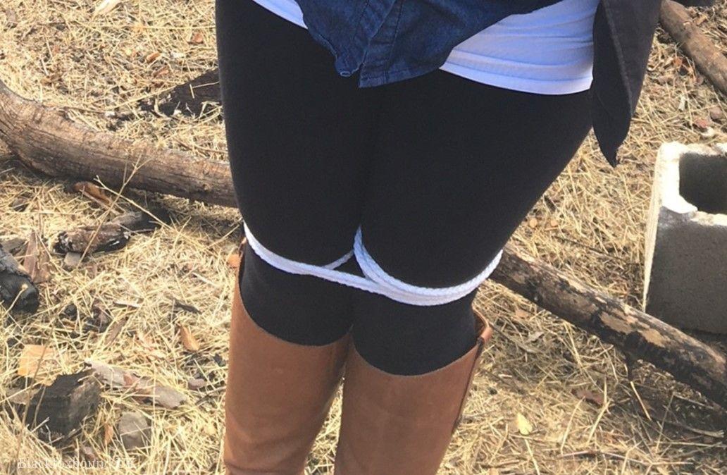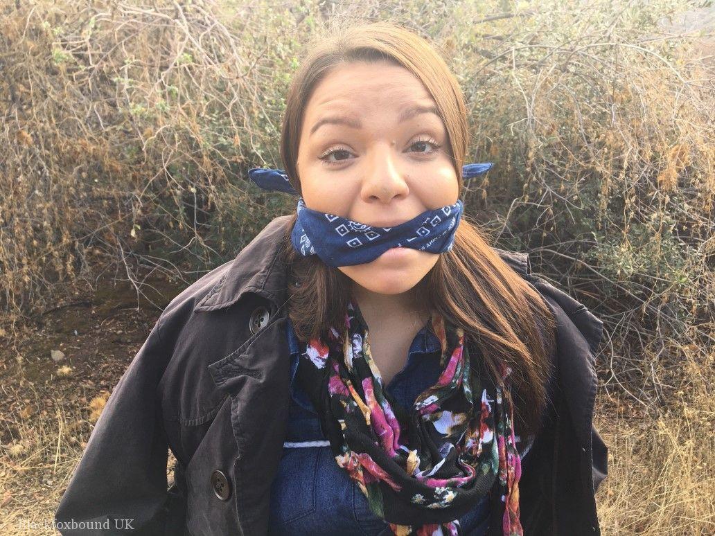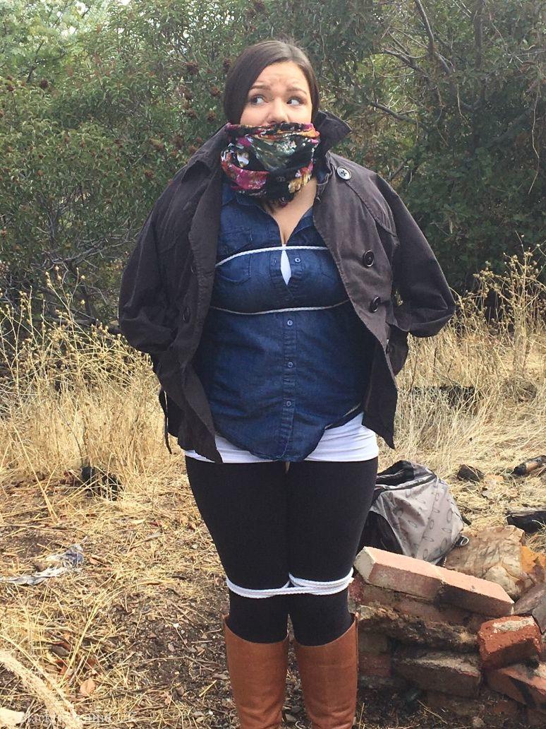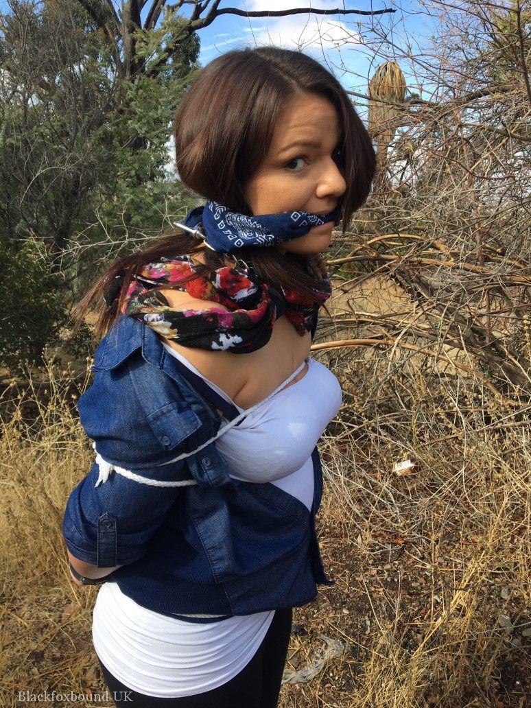 Полностью одетый толстяк расколот, с кляпом во рту и связанный веревкой в заросшем кустарником лесу
