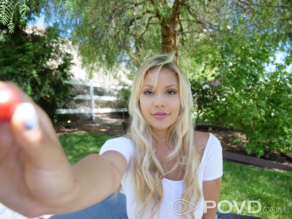 Симпатичная блондинка Кайли Пейдж обнажает свои большие натуральные сиськи в тени