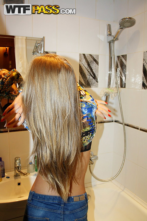 Стройная любительница обнажает свои маленькие сиськи в синих джинсах во время домашнего действа