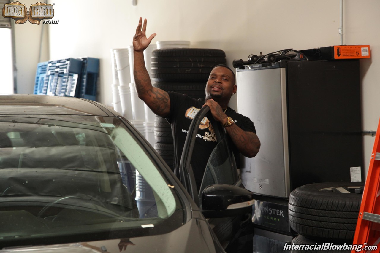 Татуированная белая цыпочка с увеличенными сиськами отсасывает группе чернокожих мужчин