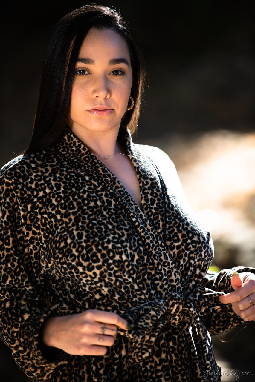Темноволосая девушка демонстрирует свои натуральные сиськи и сексуальную попку, раздеваясь